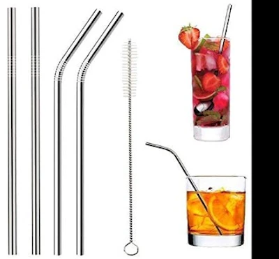 Stainless Steel Straw with Cleaning Brush- BPA-Free Metal, Long Metal Straws for Drinking, Set of 5 (2- Bend Pipe, 2- Long Straw, 1-Cleaning Brush), Silver (BSteelStrawsSilver5Pcs)